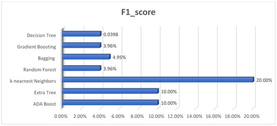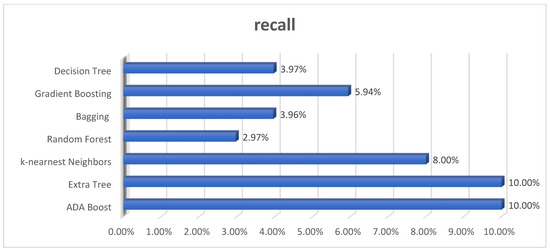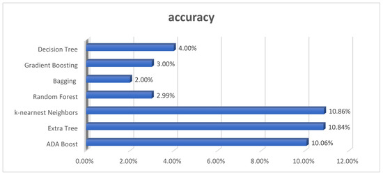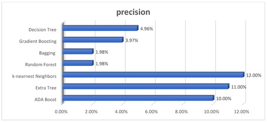 The comparison results between the SFS-ML framework and the filter–ML framework shown in Figure 9, Figure 10, Figure 11 and Figure 12 demonstrate significant improvements in various performance metrics. The AdaBoost Classifier shows a 10.06% increase in accuracy, accompanied by a 10.00% improvement in precision, recall, and F1-score. The Extra Tree Classifier exhibits a 10.84% increase in accuracy, with an 11.00% improvement in precision and a 10.00% improvement in recall and F1-score. KNN achieves a 10.86% increase in accuracy, accompanied by a 12.00% improvement in precision, an 8.00% improvement in recall, and a 20.00% improvement in F1-score. Random Forest and the Bagging Classifier show more modest improvements, with Random Forest achieving a 2.99% increase in accuracy and the Bagging Classifier achieving a 2.00% increase. Gradient Boosting and the decision tree classifier also show notable improvements, with Gradient Boosting achieving a 3.00% increase in accuracy and the decision tree classifier achieving a 4.00% increase. Overall, the SFS-ML framework consistently outperforms the filter–ML framework across various algorithms, indicating a substantial enhancement in accuracy and other performance metrics.