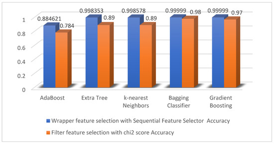 Utilizing the air quality information in Table 2, the comparative analysis of the proposed work using the filter technique and wrapper feature selection algorithms is presented in Table 4 and Figure 13. The comparison results show that wrapper feature selection with SFS significantly improves the accuracy of all machine learning algorithms compared to filter feature selection with chi2 score. Models like AdaBoost, Extra Tree, and k-nearest neighbors exhibit substantial accuracy gains, with the Bagging Classifier, Gradient Boosting, the decision tree algorithm, and Random Forest achieving near-perfect accuracy (0.99999 or higher) when using wrapper selection. This indicates that wrapper feature selection, which selects more relevant and discriminative features, enhances model performance more effectively than filter selection. Overall, the analysis demonstrates that advanced feature selection techniques, particularly wrapper selection, play a crucial role in optimizing the performance of machine learning models for tasks like air quality prediction. When compared to state-of-the-art classical ML/EL algorithms, the proposed system performs well, as our experimental findings show that its accuracy outperforms that of all other models.