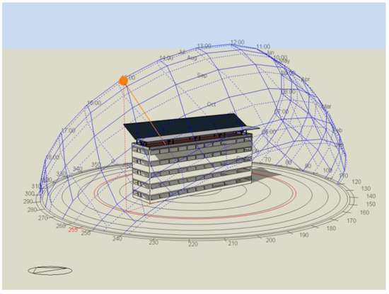 The façades feature a streamlined design with continuous “ribbon” windows, and the building is oriented so that its longer sides face north and south. The building is characterized by a high-performance building envelope. The thermo-physical parameters and thermal transmittance of the building envelope components were set in accordance with the minimum energy requirements established by Italian legislation [23], ensuring compliance with the transmittance thresholds for external walls (brick masonry with rock wool external insulation), intermediate floor ceilings (traditional insulated brick–cement ceilings + floating floor hosting electrical and water systems), and the roof (flat brick–concrete insulated slab). Double-glazed windows with argon in the cavity and an aluminum frame are provided, with dynamic integrated shading systems tailored to local solar radiation levels to maximize shading as a passive cooling strategy.