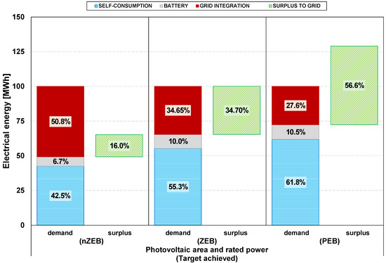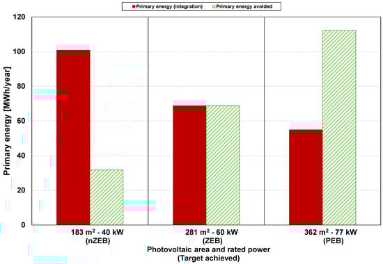 Focusing on the comparison between the energy integrated from grid and surplus generation, the primary energy, net of distribution, and transmission losses, was taken into account. Based on the equivalent electrical efficiency of Italian power plants, set as 0.504 in 2022 by the Italian government agency ISPRA [40], Figure 5 shows the primary energy balance for the three layouts: for each case, there are two bars, where the red one indicates the required primary energy related to the electricity integration from the grid, and the green-hatched one represents the primary energy that is not used by national thermoelectric plants thanks to the surplus generated by the PV field. It should be noted that the primary energy was calculated by dividing the electrical energy used for the integration and the surplus, shown in Figure 4, by the equivalent electrical efficiency of Italian power plants. The chart in Figure 5 clearly indicates the benefit of surplus production for the national grid: the nZEB case still needs 101 MWh of primary energy to fulfil the electricity demand from the grid, but the surplus of 16 MWh of electrical energy fed into the grid involves a potential primary energy saving equal to 32 MWh per year; thus, the actual primary energy demand for the 183 m2 PV field is 69 MWh, i.e., 101 MWh minus 32 MWh. Concerning the ZEB case, it can be seen that the primary energy demand for the integration equals the primary energy avoided due to the surplus; finally, in the PEB layout, there is a 55 MWh primary energy need and there is a 112 MWh primary energy avoidance, meaning that there is still 57 MWh primary energy consumption avoided from grid, which corresponds to almost 29 MWh of electrical energy to be used by other consumers somewhere else in the national grid.