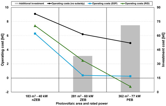 In addition to the energy analysis, the investment costs related to the three PV fields were investigated. The 183 m2 area serves as the baseline for the investment, as it represents the minimum energy coverage required for new buildings [13,14]; hence, the additional costs for the 281 m2 and 362 m2 cases were evaluated and are shown in Figure 6 with gray vertical bars. Moreover, on the same chart, the actual operating costs are shown for the no-subsidy (black line with circles), SSP (blue line with squares), and RID (green line with triangles) cases. Such operating costs take into account the expenditure for the electricity integrated from the grid minus the earnings from the net metering or purchase/resale, if any. The economic analysis is detailed in Table 4 for the three cases. According to the regulations in force, the baseline investment is mandatory for the nearly ZEB level; therefore, for the ZEB and PEB cases, only the additional investment was considered. It can be noted that for the 362 m2 (PEB layout) case, the further expense is almost double the 281 m2 (ZEB layout) case. For the baseline case, the SSP and RID mechanisms allow for annual savings of 31% (EUR 2800) and 18% (EUR 1675) in terms of operating costs, respectively. In the ZEB case, the net metering incentive is notably profitable, reducing operating costs by 94%, compared to the 60% saving achieved with the RID mechanism. Conversely, the major economic benefit for the PEB case is related to the purchase/resale scheme, which generates a positive income over the year, while the advantage of SSP is limited to a 95% saving of the operating costs. Hence, increasing the photovoltaic field beyond the minimum area required by law represents a significant financial effort, resulting in a simple payback period (SPB) of 13.3 years for the ZEB layout (281 m2) and 17.2 years for the PEB layout (362 m2). However, the financial mechanisms investigated in this study can significantly decrease the payback time to 6.5 for the ZEB case and 8.2 years for the PEB case.