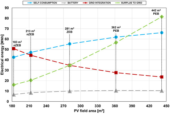 Based on the electrical energy balance depicted in Figure 4, the single components of the five layouts are shown in Figure 7, where the trend of each component can be seen. Following the increase in the PV area, from the first admissible nZEB layout (183 m2) to the full-canopy field (442 m2), both the self-consumption (blue line) and the grid surplus (green line) results increased but with different ratios. The grid integration (red line) decreased with the increase in the PV area, becoming already lower than the self-consumption amount at 213 m2 and slightly lower than the surplus for the ZEB case; this condition is the same as that shown in Figure 4, where the values of the grid integration and surplus were 34.67 and 34.72 MWh, respectively. From the first (362 m2) to the second studied PEB case (442 m2), the last curve crossing occurred when the grid surplus became greater than the self-consumption amount. Finally, the battery trend deserves a separate analysis: between 183 and 213 m2, it increased from 6.7 to 8.5 MWh (almost 26%), and from the 213 m2 case to the ZEB case, it still increased to 10 MWh (+18%). From the ZEB case to smaller-area PEB case (362 m2), there was still an increase in the battery use, even if only slightly (+5%), while going from 362 m2 to the full-canopy layout, it modestly decreased from 10.5 to 10.4 MWh. To explain this trend change, it should be considered that all the studied cases had the same energy demand; thus, an increase in the photovoltaic area does not ensure an actual increase in the exploited produced electricity due to specific temporal demands.