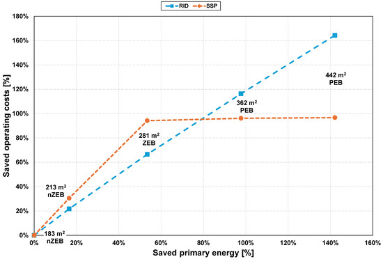 Furthermore, the percentage differences in the primary energy and cash flow were calculated with reference to the baseline for each case and are depicted in Figure 8. The results are shown for both support mechanisms, and despite the amount of primary energy avoided being the same for a given PV area, the differences in the operating costs between the SSP and RID cases are meaningful. Although the avoided operating costs due to the application of RID increased linearly (blue squares), the economic benefits caused by the SSP mechanisms did not (orange circles); the net metering scheme encourages the appropriate design of the renewable energy field whilst avoiding oversizing for economic profitability. This rationale can be appreciated by considering the orange line shown in Figure 8, as it demonstrates a strong increase up to the ZEB layout (281 m2), after which the avoided operating costs remain constant. As clearly shown in Figure 8, the two additional layouts of the photovoltaic field (213 and 442 m2) were relevant to confirm the trend of profitability arising from the three initial layouts (183, 281, and 362 m2) for both the financial mechanisms. Moreover, the different profitability values shown by the two schemes can be explained based on their formulations: the revenue gained from the net metering is strictly related to the minimum between the electricity purchased and the electricity resold (Equation (1)), while the revenue gained from the RID scheme is only a function of the surplus electricity multiplied by the hourly zonal price. Therefore, a large amount of electricity exceeding the building demand only involves an economic benefit for the RID scheme, while it is not considered in the SSP scheme since the surplus becomes higher than the amount of purchased energy; on the other hand, to maximize the profitability of the SSP scheme, the PV field should be designed with the aim of equalizing the two energy components, i.e., the energy purchased and sold.