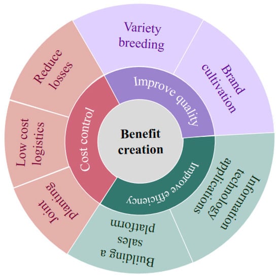 The optimization and development of CrAPSC not only added value but also, and more importantly, created new value. Benefit creation was the premise and foundation of benefit sharing. The theory of value creation suggested that enterprises could create value through the use of resource technology and information to achieve economic growth [33], emphasizing the improvement of internal production and supply processes. As shown in Figure 3, we categorized benefit creation according to three dimensions (i.e., cost control, efficiency improvement, and quality improvement) and emphasized value addition by focusing on external consumer demand response (demand for quality improvement) while also improving internal supply chain performance. The benefit creation process was a Pareto optimization process, in which the greater the value surplus was within the supply chain, the greater the amount of benefits that partners could share [34]. The spatial extension of the CrAPSC made it more complicated to match supply and demand, lengthened the upstream and downstream market chains of the supply chain, and sharply increased the production cost of the supply chain. Therefore, it was essential to control the overall cost of the supply chain. In addition, “Collaboration between producers and buyers in planting and harvesting” (c1-01) “development of high-speed and low-cost logistics” (c4-21) and “reduction of losses in agricultural product reserves” (c1-26) were the top priorities for cost control and value enhancement. Against the backdrop of increasing market uncertainty, the stability and high efficiency of the supply chain were important guarantees for the long-term development of enterprises [35]. Furthermore, “Implement control and data management for the whole process of crop cultivation, management and harvesting” (c5-16) supported the application of supply chain information technology. It was noted that the “JD.com platform has formed a complete system of product sales, distribution and after-sales service” (c5-31), which was conducive to improving the transparency of information in supply chain, thus helping enterprises identify market demand in a timely and accurate manner and improve the supply chain’s operational efficiency. From the consumer side, consumer demand for certain agricultural products was largely influenced by certain quality characteristics of such products [36]. The selection of good varieties, standardized production, cultivation of brands, and good service highlighted the distinct quality attributes of agricultural products, and consumers were more willing to buy and recognize the value of agricultural products.