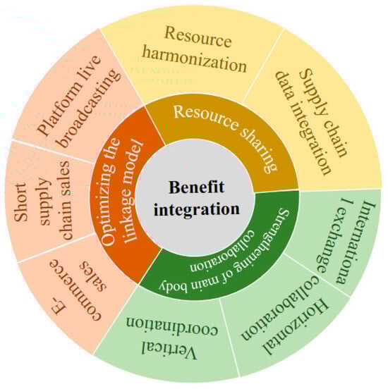 It has been shown that the integration of stakeholders’ benefits could fully rationalize the systematic allocation of resources in the supply chain and clarified the roles and tasks of stakeholders [37]. The integration of benefits required an adjustment to the effective supply of the object of benefit, an adjustment of the concept and behavior of human benefits, and an adjustment of the relationship of benefits between people, including the three dimensions of resource sharing, strengthening of main body collaboration, and optimizing the linkage model, as shown in Figure 4. Resource sharing provides the basis of benefit sharing, and the sharing of resources in the CrAPSC emphasized the “in-depth integration of various systems to open up the whole chain and the whole process of data” (c2-03). This integration promoted the sharing of resources across the links of production, processing, circulation, and sales of agricultural products and supported the unified deployment of resources in all aspects, thus solving the problems of information asymmetry in the traditional supply chain. The supply chain also strengthened the main collaboration, including international exchanges, horizontal collaboration and vertical coordination. Frequent national exchanges raised “international agricultural trade collaboration to a new height” (c1-32), horizontal collaboration “realized the enterprise mission of efficient circulation and deep distribution of products” (c2-07) and vertical coordination “improved the market acceptance of products” (c2-15), promoted the supply chain’s original improvement, and upgraded the functional attribute system [38]. The main body collaboration improved the technological development and research capacity of the CrAPSC and optimized the supply chain service process oriented by the domestic and international market demand, which further supported the interrelationships of the links and achieved the integration and optimal allocation of benefits [39]. Experience and practice have shown that each link in the CrAPSC cannot rely on its own innovative approach to maintain a long-term competitive advantage [40]. Only by continuously innovating the organizational framework and linkage model of the supply chain [41], restructuring the agricultural supply chain by e-commerce sales, short-chain direct marketing and platform live broadcasting, and coordinating the partnership of each link in the supply chain [42,43] can the benefit-sharing mechanism of the CrAPSC be improved.