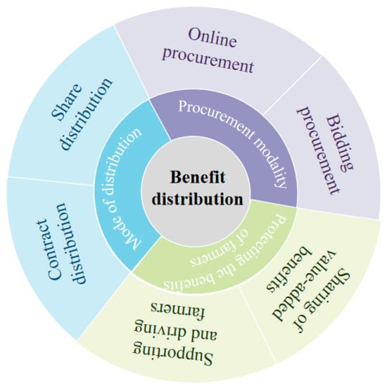 The procurement modality affected the distribution of benefits. Compared with the traditional procurement model, online procurement created an “electronic and transparent procurement model” (c2-25). In addition, tender procurement “established a direct purchasing channel dominated by large enterprises” (c2-25), which achieved economies of scale through centralized purchasing and helped enterprises improve purchasing efficiency, reduce supply chain costs, and establish long-term partnerships [45]. The mode of distribution was directly related to the maximization of individual benefits and the benefit-sharing mechanism among supply chain members. New distribution methods, such as contract distribution, share distribution, and investment support, were conducive to the formation of a long-term cooperative relationship between upstream and downstream subjects in the supply chain [46] and they also promoted a reasonable distribution that met the benefits of all parties. According to the perspective of agricultural modernization, a breakthrough in the farm household economy was the key factor needed to realize the scale, intensification, and marketization of agricultural production as well as future information technology advancements [47], and it was necessary to increase the importance and influence of farmers in the supply chain [48]. To ensure the sustainable development of the supply chain and the basic protection of investors’ benefits, we must “let ordinary farmers share more of the value-added benefits of the industry” (c5-04) and improve the distribution of benefits between farmers and enterprises. As a result, all stakeholders could negotiate on the same mechanism platform [49] and thus could achieve the benefit-sharing mechanism and the sustainable development of the supply chain. The main elements of benefit distribution are shown in Figure 5.