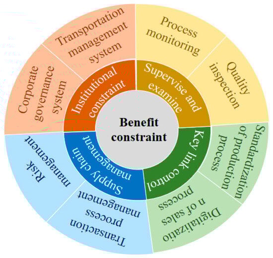 The benefit constraint is an extremely effective part of the constraint mechanism. Benefit constraint refers to the adoption of various methods, such as supply chain management, institutional constraints, supervision and examine, and key link control, to exert influence on the operation process, as shown in Figure 6. The goal is to constrain the benefit factors in the supply chain operation process. Supply chain management is an important means of benefit constraint and is a prerequisite for the establishment of a benefit-sharing mechanism. By managing the supply chain transaction process, it was possible to reasonably arrange the time and resources of production, processing, transportation, and other links to constrain the behavior of supply chain subjects [50]. Moreover, supply chain risk management is also an important element of CrAPSC management [51] and can “embed risk prevention and control in all aspects of the business process, and enhance the ability to identify and dispose of risks” (c4-26), which ensured that the supply chain would be unimpeded if emergencies occurred. Institutional constraints directly constrained the benefits of all parties, the corporate governance system constrained the behavior of supply chain subjects, and the transportation management system constrained the supply chain operation process. To establish a CrAPSC benefit-sharing mechanism, it is necessary to eliminate institutional barriers that are unfavorable to the development of the supply chain through institutional coordination and reform, establish a standardized institutional mechanism, and provide a level playing field for all participants. Strengthening supply chain supervision and examination can effectively limit the opportunistic behaviors of members of theCrAPSC and constrain their benefit boundaries [52] by “implementing classified supervision and establishing a process supervision system supported by information technology” (c2-51) and by “strengthening the key links such as loading and quality certification” (c3-13). As a result, the co-construction and co-rule of process control and quality inspection of the CrAPSC promoted honesty and self-regulation of the main body in the supply chain [53]. In addition, it was necessary to control the key links in the operation of the CrAPSC, such as “promote agricultural production and the cultivation of farmers and businessmen” (c5-29) in the production link and “accelerate the construction of e-commerce layout of benefit and realize digital integrated marketing” (c2-62) in the sales link, to constrain the economic behavior of the main body.