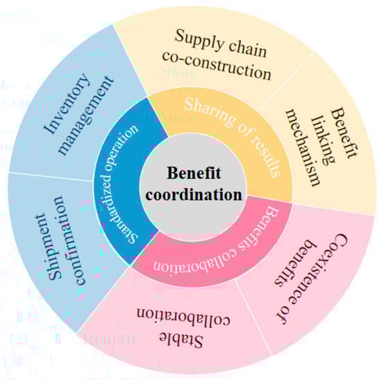 Benefits are shared among the participants in the system, with the ultimate goal of coordinating benefits among the various subjects and reducing the boundaries and conflicts of benefit between them. In addition to simultaneously satisfying the reasonable needs of each subsystem, the overall function of the coordinated system was greater than the sum of the functions of the original subsystems, and the harmony and stability of the relationship between the stakeholders was maintained [54]. Coordination contract theory suggests that the method of supply chain benefit coordination is to design an effective incentive contract that motivates node firms to maintain strategic collaboration [55]. Competition theory assumes that benefit coordination presupposes the harmonization of competitive and cooperative relationships between subjects [56]. The coordination of benefits in this study was a continuous dynamic evolutionary process, which we specifically divided into three stages: the premise of benefit coordination was the standardized operation, the core element was the collaboration of benefits, and the result was the sharing of results, as shown in Figure 7. The prerequisite of benefit coordination was selected to ensure the standardized operation of the supply chain, including delivery confirmation and inventory management. Delivery confirmation ensured the “stable supply of livelihood materials” (c1-35). The members of the supply chain coordinated the inventory management policy to achieve the system optimization of the supply chain [57] and to improve the supply chain’s market responsiveness and product and service quality. The core element of benefit coordination was the collaboration of benefits. If the upstream and downstream subjects of the supply chain failed to reach a close collaborative relationship, they would fall into the internal competition of the supply chain in the process of supplying agricultural products with high risk and low added value. For this reason, cross-regional supply chain market players should take strong measures to guide supply chain members transcend geographical and administrative restrictions, thus “establishing the strongest relationship with important people in the industry” (c5-40). The sharing of results was due to the coordination of benefits through the establishment of benefit linking mechanisms, supply chain co-construction, and resource interoperability. Each member enterprise in the supply chain could obtain valuable information, realize complementary advantages, and achieve coordination of benefits [58]. As a result, they effectively reduced costs, increased profits, improved product quality, reduced systemic risks [59,60], enhanced the overall competitiveness of the supply chain, and maintained long-term relationships.