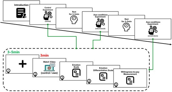 The experiment was based on a willingness to pay task paradigm and was within-subjects designed. It consisted of a control condition and two experimental conditions (natural awe and social awe). All the participants first underwent the control session and then the experimental sessions. The two experimental sessions were counter-balanced. In the control session, first, the participants watched a 3 min video to establish a baseline state; then, they completed the emotion scale and the natural and social awe emotions differential scale. Finally, they performed the willingness to pay task. The two experimental conditions and the control conditions had consistent sessions (Figure 2), except for differences in the content of the presented video screens (refer to Section 3.1 for details). Before the formal experiment, the participants were instructed about the purpose of the experiment, the experimental procedure, and some guidelines. A demo session was conducted for the participants to practice. The materials presented in the practice session did not appear in the formal experiment.