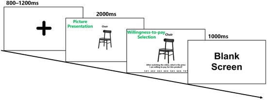 During the willingness-to-pay measurement stage, a fixation point (“+”) was first displayed at the center of the screen for 800–1200 ms. This was followed by displaying a product image for 2000 ms, with the product label text displayed above the image (e.g., flower pot, recycled chair, etc.). Subsequently, seven different optional prices were displayed on the screen, and the participants responded by pressing keys “1–7” to indicate the highest price they were willing to pay for the product. Afterward, a blank screen was presented for 1000 ms to allow participants to prepare for the next trial (Figure 3). Each condition contained 30 product images, totaling 90 trials. Each product image appeared once as a natural product and once as a recycled product (distinguished by the label text).