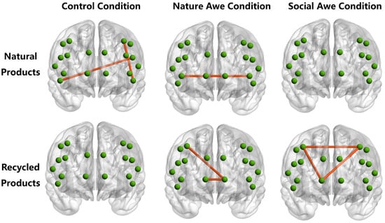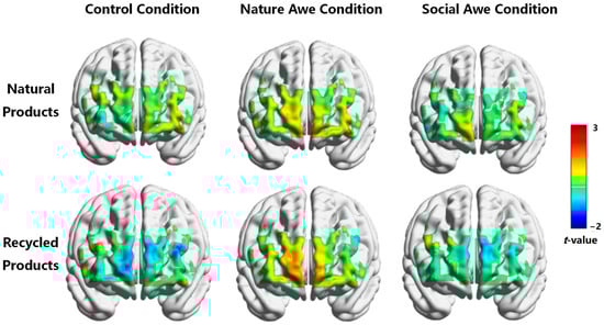 - Functional Connectivity Analysis Results. In the control condition experiment, functional connectivity was observed between the ventromedial prefrontal cortex and Broca’s area, as well as between the ventromedial prefrontal cortex and the dorsolateral prefrontal cortex. This suggests that participants, when first exposed to the experimental tasks, performed comprehensive evaluations of linguistic and emotional information, enhancing brain functional connectivity. The awe condition experiment triggered greater activation and stronger functional connectivity in the dorsolateral prefrontal cortex. Furthermore, during the value assessment of recycled products, functional connectivity was observed between the dorsolateral prefrontal cortex and the frontal pole, indicating that participants often consider past experiences during evaluations to assist in more in-depth decision-making.