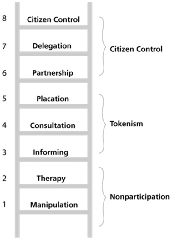 - Arnstein, S.R. A Ladder of Citizen Participation. J. Am. Inst. Plan. 1969, 35, 216–224. [Google Scholar] [CrossRef]