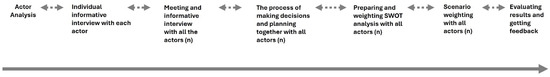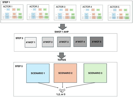 In the strategic spatial planning process, actors can support the different scenario alternatives they perceive as closer to themselves, thereby advocating for various objectives, strategies, and actions. What is performed here is to maintain the alternative as an alternative while prioritizing it for implementation. At the end of the participatory process shaped by the involvement of actors, one of the scenario approaches must be selected for immediate implementation. Ensuring that this selection considers the choices of all participants and checks that the expectations of participants do not create internal contradictions can be achieved through the presentation of an innovative participation model. The steps of this participation model are graphically presented in Figure 2.