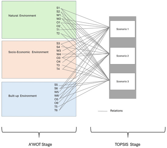 The weighting process obtained after the A’WOT analysis is followed by the TOPSIS process. According to this, each analysis topic S(n), W(n), O(n), T(n) hypothetically contributes to the content of one or more scenario approaches and is relevant. This content can be detailed according to the researchers’ choices. For example, it can be matched with strategies to be included in strategic spatial planning or with implementation projects at a lower scale. However, in this study, it is assumed that there is a direct relation to a scenario with a higher-scale approach.