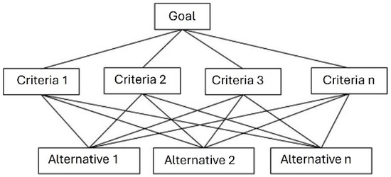 The Analytic Hierarchy Process (AHP) is a multi-criteria decision support system developed by Saaty [56]. AHP is a powerful and easily understandable methodology that enables groups and individuals to combine qualitative and quantitative factors in the decision-making process [57]. It involves constructing a hierarchical tree where the main objective and its associated criteria are compared pairwise against each element in the upper hierarchy, obtaining values and ultimately leading to prioritization (Figure 4).
