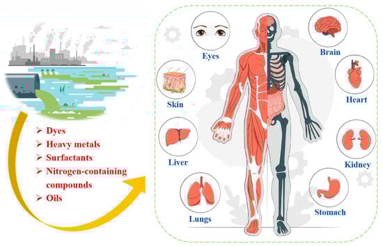 TDW originates from multiple industrial processes and exhibits a highly complex composition with diverse pollutant types with varying environmental impacts, as shown in Table 1. Dyeing, desizing, and scouring are the primary sources of water pollution in TDW. The characteristics of TDW include noticeable coloration, high COD, presence of suspended solids, and elevated pH levels (9–11) [36]. As shown in Figure 1, key components of TDW are dyes, heavy metals and surfactants et.al., which are very harmful to human health. The details are described as follows.