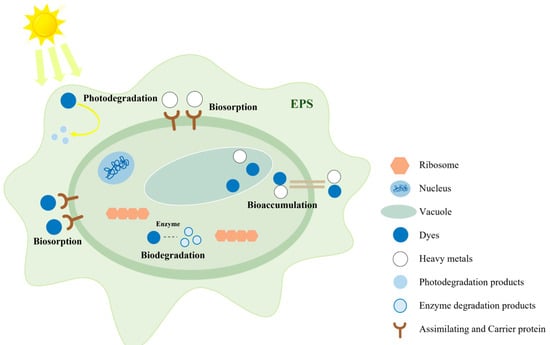 Algae can degrade dyes of various colors, primarily through biosorption. Biosorption is a fundamental mechanism by which algae remove different types of dyes. This process involves forming complexes between dyes and functional groups on algal surfaces, such as amino, phosphate, carboxyl, and hydroxyl groups. Other biosorption mechanisms include ion exchange with cationic molecules and van der Waals interactions that enhance dye absorption [171]. Biological flocculation is a component of algal bio-adsorption. As dyes undergo transformation via metabolism-assisted processes, dye molecules aggregate on the surface of extracellular biopolymers produced by algae [172]. These exogenous long-chain biopolymers, which comprise surface functional groups, exhibit excellent flocculation properties and continually adsorb and precipitate dye molecules from aqueous solutions.