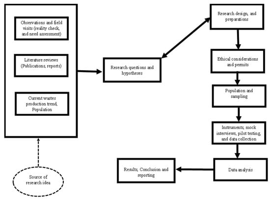 Figure 2, where it begins with the generation of research ideas through observations, literature reviews, and assessments of waste production trends, leading to the formulation of research questions and hypotheses, followed by research design, ethical considerations, sampling, instrumentation and conduction of the mock and pilot testing before the full process of data collection, analysis, and concluding with the results and reporting.