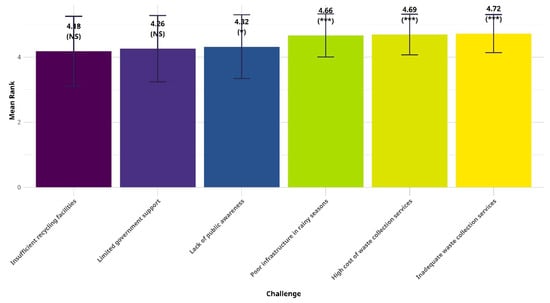 p < 0.001). In contrast, insufficient recycling facilities (mean rank = 4.18) and limited government support (mean rank = 4.26) are ranked lower and do not differ significantly (NS), indicating they are perceived as less pressing issues. These results highlight a prioritization of challenges related to waste collection services and cost as the most urgent for intervention.