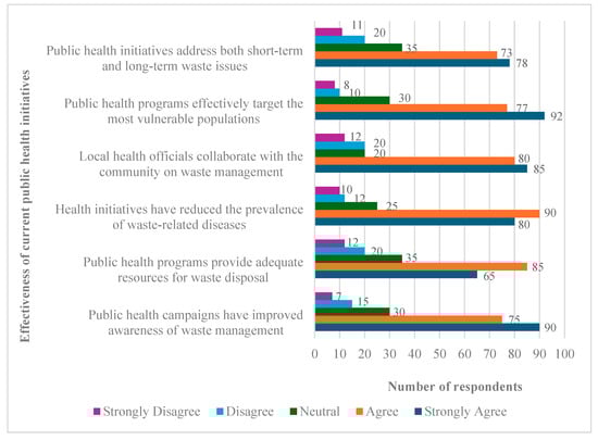 Figure 6 demonstrate that the current public health initiatives are perceived as effective in several key areas. For example, 75 respondents (34.6%) strongly agree, and 65 respondents (30.0%) agree that public health campaigns have improved awareness of waste management, totaling 140 respondents (64.6%) expressing positive responses. Similarly, 90 respondents (41.5%) strongly agree, and 80 respondents (36.9%) agree that health initiatives have reduced the prevalence of waste-related diseases, showing strong approval, with 170 respondents (78.4%) acknowledging their effectiveness. These findings emphasize the notable successes of these initiatives in raising awareness and mitigating health risks.
