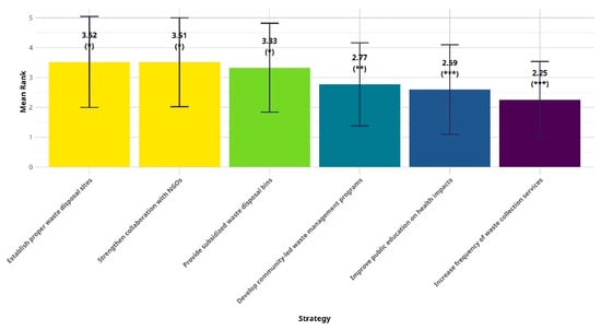 Figure 7 emphasize that increasing the frequency of waste collection services has the lowest mean rank (2.25), indicating it is perceived as the most effective strategy, followed closely by improving public education on health impacts (2.59) and developing community-led waste management programs (2.77). Additionally, strategies such as providing subsidized waste disposal bins (3.83), Strengthening collaboration with NGOs (3.51), and establishing proper waste disposal sites (3.52) have higher mean ranks, suggesting they are considered less impactful. The significant differences across rankings highlight clear preferences for strategies prioritizing direct waste collection improvements and education initiatives.