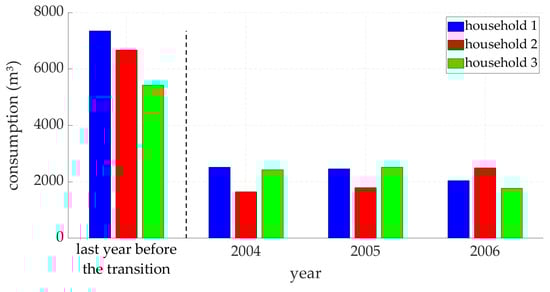 The reduction in water consumption due to the transition from the roof tank-based system to the demand-driven system, which occurred between 2000 and 2003 in all three households. The first group of bars in the graph represents the consumption data prior to this transition.