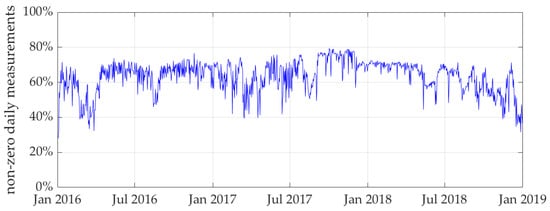 The flow meters that in a single day recorded non-zero measurements in the analyzed period range from 28% (1087 flow meters) to 80% (3072 flow meters), with an average of 60% (about 2400 flow meters). Figure 2 shows that the daily efficiency of the smart metering system (obtained as the ratio between the non-zero daily measurements and the 3866 residential meters analyzed) is highly variable, with a decreasing trend in measurements collected in the last year analyzed. To avoid that the eventual switching off of some flow meters essential for PF estimation permanently influence the analysis, maximum aggregations of 1000 flow meters are considered, that is, the minimum number always recorded by the system in the four years considered.
