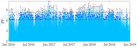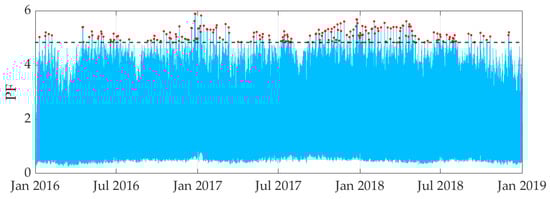 Furthermore, regardless of why a PF occurs, a distinction needs to be made between ordinary PFs that occur daily and extreme PFs. The functionality of the system is undermined by the latter; therefore, it is these values that the authors intend to focus on in this work. Dividing extreme events from ordinary events is a common practice in time series analysis. The set of PFs is a time series, so extreme value analysis methodology can be applied to these data.