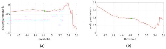 After determining the optimal threshold, it is possible to estimate the parameters of the GPD, also known as the Pareto–Pickands distribution [20]. Given a location parameter , a shape parameter , and a scale parameter , which in the case of modeling POT models will be dependent on the choice of the threshold u, independent observations of threshold exceedance are assumed to be GP-distributed with , and . Leaving the complete definition of GPD to the literature articles [11,21], the cumulated distribution function of the GPD is given by