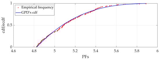 Following the steps of the proposed procedure, the hourly PFs relating to the aggregation considered were calculated for all the data recorded from January 2016 to December 2018. Subsequently the POTs were identified for each single possible threshold according to the characteristics required by the PDS theory. The POTs identified using this procedure for the aggregation of 600 users are shown in red in Figure 3. Looking at the graph, it can be clearly seen how the POTs are distinct from the rest of the time series, which instead contains the maximum daily PFs recorded on ordinary days. This distinction clarifies how the proposal of this work, aimed at identifying the probability of an extreme event, differs from the rest of the works proposed regarding PFs.