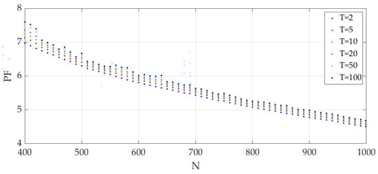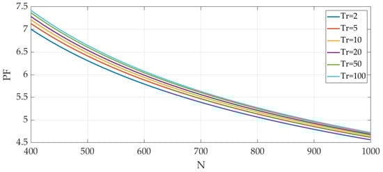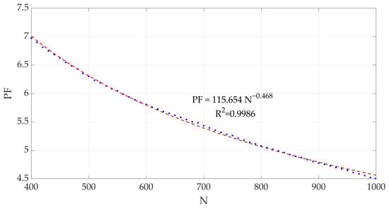 The points represented exactly follow the trend of a curve for return periods comparable to the one measured (return periods equal to 2 and 5 years), while a slight uncertainty is observed for longer times. Nonetheless, it is possible to identify the presence of a scaling law in any case. Thus, we can fit the estimated PFs with a power curve, which exhibits an excellent level of fitting for each T (the coefficient of determination R2 remains consistently above 0.99, ranging from 0.9986 for T = 2 years to 0.9903 for T = 100 years), as demonstrated by the example presented in Figure 8 for the return period of 2 years. The function that evaluates the PF at a certain T (in years) for an aggregation of N flow meters is