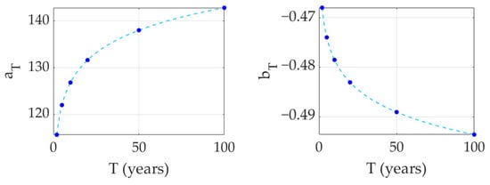 Scaling laws of parameters constituting Equation (7). The blue dots represent the a and b estimated at the relative return period T; the dotted lines represent the scaling laws of the single parameters (Equations (8) and (9)).