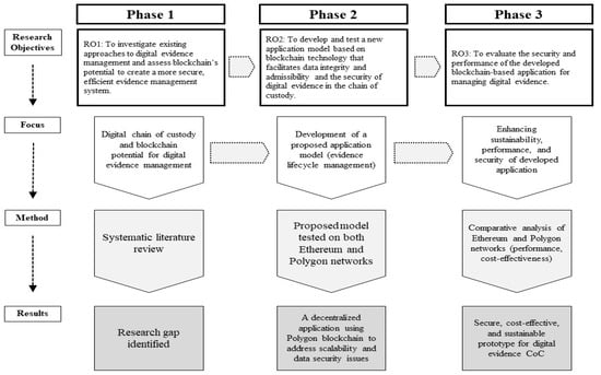 There were three phases to this research project, oriented around the research objectives (Figure 1), each adopting different methods. In Phase 1, a literature review was conducted to explore blockchain technology’s role in ensuring the integrity, admissibility, distribution, and scalability of digital evidence throughout the CoC. A literature review can develop a thorough understanding of the current state of knowledge within a specific field and identify gaps in the existing literature. This is reiterated by Hart [55], who observed that “the literature review serves to position the research within the existing body of knowledge, making it possible to highlight areas where further investigation is necessary and to construct a solid foundation for the research framework”. Fink [56] similarly made the point that a well-conducted literature review can allow the validity and relevance of prior studies to be assessed, and the findings can support subsequent stages in the research process.