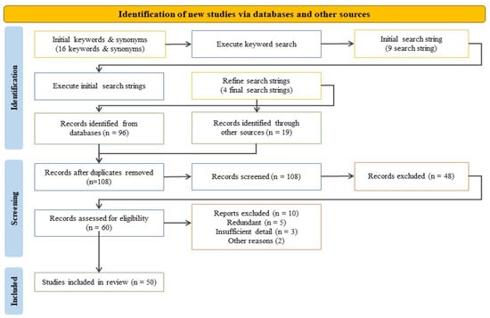 There are various approaches to conducting a literature review, each with its own strengths and limitations. Here, a systematic literature review (SLR) was undertaken. Such reviews are highly structured, allow reproducibility, and minimise the potential for researcher bias [57]. Greenhalgh et al. [58] noted that “systematic reviews are generally placed above narrative reviews in an assumed hierarchy of secondary research evidence,” and that their advantages are in the transparent and methodical manner in which literature can be found and analysed. As Kitchenham et al. [59] (p. vi) noted, “a systematic review is a means of evaluating and interpreting all available research relevant to a particular research question, topic area, or phenomenon of interest. Systematic reviews aim to present a fair evaluation of a research topic by using a trustworthy, rigorous, and auditable methodology”. The Preferred Reporting Items for Systematic reviews and Meta-Analyses (PRISMA) protocol [60] was used to provide an overarching framework for the review (Figure 2). The steps in the PRISMA protocol help determine the search strings, the inclusion and exclusion criteria, executing the search string, selecting articles, extracting data from the articles, synthesising the data, analysing the results, and, finally, writing the research report or thesis.