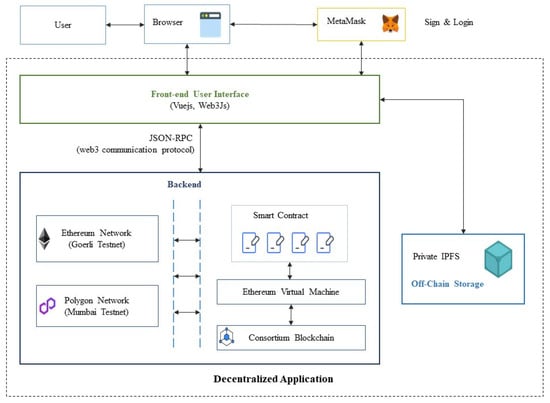 - Ethereum/Polygon blockchain: The proposed model was deployed and tested. Initially, testing was performed on Ganache, a localised blockchain network emulator designed for DApp testing and debugging. Following successful local testing, it was deployed to Ethereum Mainnet (Goerli testnet) and Polygon networks (Mumbai testnet). These networks are discussed in Section 2.4 above.