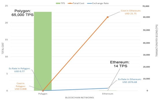 Figure 4 illustrates the inverse relationship between transaction costs and network throughput for Ethereum and Polygon networks. The network performance is measured in transactions per second (TPS), with Ethereum processing 12–14 TPS, while Polygon achieves 65,000 TPS ([54], Table 4). The figure compares exchange rates (blue line) and TPS (green bars), and shows how total deployment costs (orange line) decrease from Ethereum (USD 21.71) to Polygon (USD 0.008), highlighting the efficiency gains of higher transaction speeds and indicating that using Matic for transactions can save about USD 21 per contract deployment compared to Ether, representing a significant 99.96% cost efficiency improvement, making Matic a more financially viable and sustainable option.