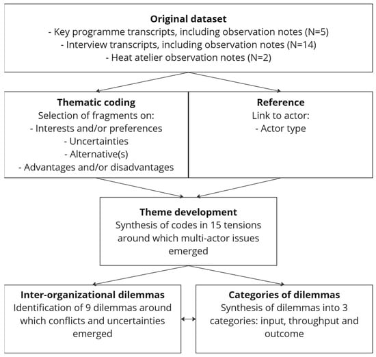 An iterative, interpretative process was used to code and analyse the primary data. The first step in coding involved identifying and selecting text fragments that contained statements about what was desired or required for the coordination of regional heat infrastructure development. In addition, we looked for significant uncertainties. Every statement was linked to an actor type, e.g., formal RES party, local actor and/or private actor. This resulted in a preliminary overview of conflicts and uncertainties. Fragments that described the same tensions were grouped into 15 themes around which multi-actor issues emerged (see Figure 1). Next, based on the themes, we conducted a more thorough second round. During the second round, we identified 9 difficult choices between two alternatives that illuminated explicit focal points of tensions in the interorganizational strategy process. During the course of the second round, patterns between subsets of dilemmas became apparent. Based on our observations, the dilemmas were grouped into three categories: input, throughput (or process) and outcome. These groups resemble elements of the ‘logic model’ [54], which comes from systems thinking and is often applied in management studies, for example to evaluate (inter)organizational coordination and performance [55,56,57,58]. The three categories are not meant to conceptualize the interorganizational strategy process but to help provide a more granular view of the types of dilemmas organizations may encounter within it.