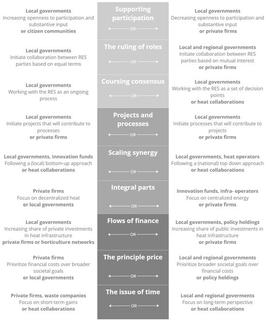 Overview of the identified dilemmas in the interorganizational RES-TH strategy process. The figure visualizes the tensions between actors we highlighted and is not meant to be a comprehensive overview of either the involved organizations or their interests in the strategy process.