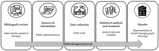 The research carried out in this article is based on the procedural development of a methodology consisting of five sequential stages: (1) an exhaustive review of the existing literature, (2) obtaining preliminary data through searches in public repositories that offer open access to information, (3) collecting and requesting documentation related to urban public transport from government administrations, (4) processing the information using statistical analysis techniques, and (5) using Geographic Information Systems (GIS) tools in order to carry out a spatial analysis. Figure 1 illustrates the procedure carried out in this research, providing a visual representation of the previous stages described.