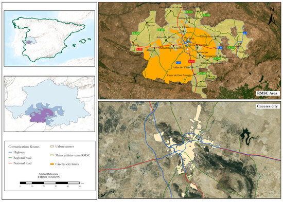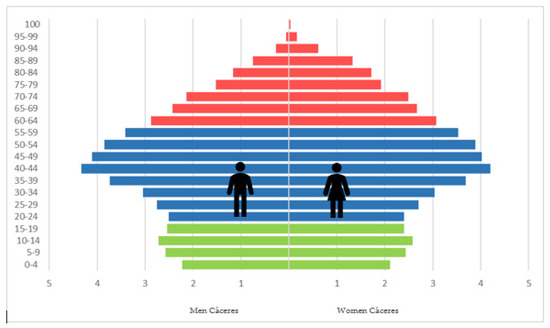 The municipality of Cáceres, the largest in Spain with more than 1500 km2 and the capital of its province, plays a central role as the socio-economic, administrative and commercial hub of the Extremadura region. Its influence extends to all the surrounding municipalities, making the area a true metropolitan area. This area is part of the Network of Sustainable Municipalities of Cáceres (RMSC), which includes a total of 21 towns, including Malpartida de Cáceres, Arroyo de la Luz, Casar de Cáceres and Trujillo, among others. It is also worth mentioning the smaller local entities outside the urban centre (Valdesalor and Rincón de Ballesteros) and the small hamlet of Estación Arroyo-Malpartida. Cáceres has established itself as a point of reference in the cultural, tourist and economic spheres within the study area, thanks to a communications network that facilitates travel between the different municipalities. These roads include the A-66 (which crosses the province from north to south) and the A-58 (which connects Cáceres and Trujillo with the A-5 motorway). In addition to the dual carriageways, there are national and regional roads linking the municipalities of the RMSC with the city of Cáceres. In addition, there is also the road network managed by the Cáceres Provincial Council, which extends the connections between the municipalities with a smaller number of citizens. According to data from the National Statistics Institute (INE, 2022), the population of Cáceres is 95,456 inhabitants. The age structure reveals a regressive population pyramid, characterised by a high percentage of adult and elderly population. The low birth rate and the low number of young people generate negative vegetative growth, indicating a trend towards population ageing and population decline in the long term.