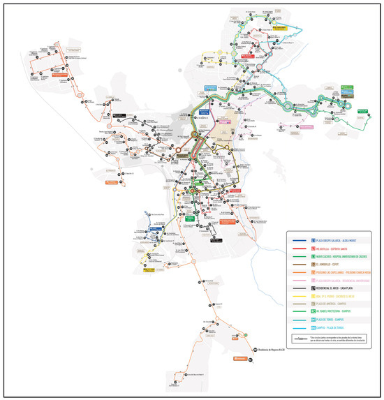 Representation of the bus lines in the city of Cáceres. Source: SuBus Vectalia (https://caceres.vectalia.es/planos/, accessed on 2 December 2024).