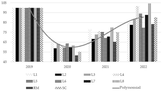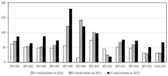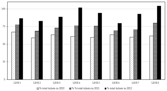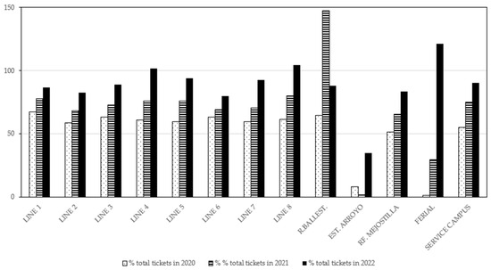 Passenger flow on each transport line is closely linked to the population density of the area and the mobility habits of residents. Although there is a general trend of recovery after the COVID-19 pandemic, not all routes have managed to reach pre-pandemic levels of demand. Taking 2019 as a reference year, in which ticket sales settled at 100%, a comparative analysis has been carried out to assess the impact of the health crisis in subsequent years. The results, visualised in Figure 9 and Figure 10, allow us to identify the most affected lines and analyse the possible causes of these variations, considering factors such as connectivity, service frequency and the socio-economic characteristics of the areas served.