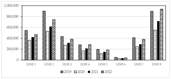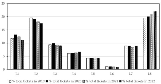 Although more than 15 million passengers used the urban transport service in Cáceres during the period analysed, demand is not evenly distributed between the different lines. Figure 6 shows the variability in ticket sales for each line (L1–L8) over the years studied. This heterogeneity in demand can be attributed to various factors, such as the socio-demographic characteristics of the areas served, the frequency of the service, connectivity with other modes of transport and users’ perception of the quality of the service.