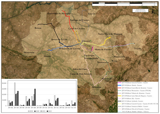 The results presented in Figure 7 and Figure 8 reveal a positive trend common to both urban and interurban transport lines in the study area: a gradual recovery of passenger flow during the period 2019–2022. However, a more detailed analysis of the quantitative data reveals a marked difference in the volume of tickets sold. While interurban transport in the RMSC registered 776,882 tickets, urban transport in the municipality of Cáceres exceeded 15 million in the same time period. This disparity, although partly explained by the difference in population (41,031 inhabitants on average in the RMSC vs. 95,814 in Cáceres), suggests the existence of other factors, such as the density of the urban network, the frequency of services and the socio-economic characteristics of the population, which could influence the demand for each mode of transport.