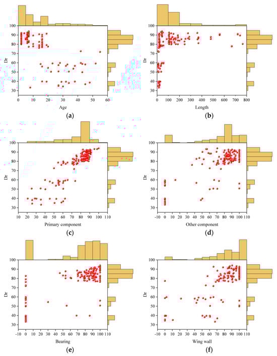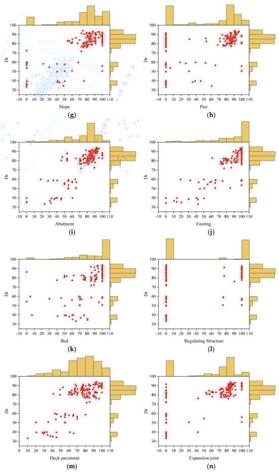 The data distribution of the overall technical condition score of the bridge and the influencing factors. (a) Bridge age and overall bridge technical condition score; (b) Bridge length and overall bridge technical condition score; (c) Primary component and overall bridge technical condition score; (d) Other component and overall bridge technical condition score; (e) Bearing and overall bridge technical condition score; (f) Wing wall and overall bridge technical condition score; (g) Slope and overall bridge technical condition score; (h) Pier and overall bridge technical condition score; (i) Abutment and overall bridge technical condition score; (j) Footing and overall bridge technical condition score; (k) Bed and overall bridge technical condition score; (l) Regulating Structure and overall bridge technical condition score; (m) Deck pavement and overall bridge technical condition score; (n) Expansion joint and overall bridge technical condition score; (o) Sidewalk and overall bridge technical condition score; (p) Guardrail and overall bridge technical condition score; (q) Drainage and overall bridge technical condition score; (r) Lighting and Sign and overall bridge technical condition score.