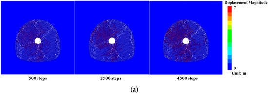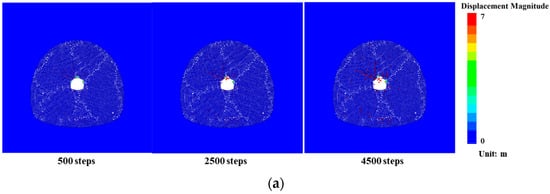 Following these on-site measured data and the stress inversion results mentioned above, the discrete and continuous coupling simulation for rock burst failure was conducted for the tunnel transverse sections with different buried depths and lithological conditions. Since the spatial layout of the Xuefeng Mountain No.1 Tunnel was a herringbone shape, the depth of the surrounding rock masses possessing the same lithology and geological structure in the tunnel might be different due to location. To investigate the differences in rock burst evolution, the model of the tunnel possessing the same geological conditions and buried at different depths was employed to conduct a comparative analysis by selecting two sections with similar depths. Displacement contours under different operational conditions are illustrated in Figure 15, Figure 16 and Figure 17. Notably, some model particles had already displayed initial dispersion at 500 calculation steps. When the calculation step reached 2500–4500, sheet-like splitting began, accompanied by particle ejection. After 2500 steps, the model predominantly exhibited block collapse and significant particle ejection, leading to a significant increase in large displacement particles within the model. Particles at the unloading surface appeared as contact failures on the displacement vector map, indicating a greater displacement. The total displacement of the tunnel vault showed a gradual decrease from the rock wall towards the deeper surrounding rock masses. During a rock burst occurrence, the inverted arch, arch foot, and both sides of the arch waist were greatly affected by the release of geo-stress, exhibiting greater vault displacement compared to the tunnel crown. Moreover, as the buried depth increased, the total displacement was more profoundly influenced by initial geo-stress, showing a continuous upward trend. These displacements indicated an increasing trend with calculation steps, demonstrating a left-right asymmetry due to the uneven distribution of the initial geo-stress. Upon comparing the crack generation process across models at varying buried depths, it became evident that, with the increasing geo-stress and computational steps, there was a deepening dispersion of model particles. Subsequently, the connection between the later-stage peeled-off particles and the main model particle fractures resulted in a state of separation. Furthermore, as buried depth increases, the color distinction of the displacement vector distribution map becomes more pronounced. This finding highlights larger absolute differences in particle displacement inside the model, indicating that there should be a greater instability of these surrounding rock masses being subjected. When examining the displacement distribution maps of different types of surrounding rock masses, it was observed that both slate and granite arches exhibited similar patterns of large displacement areas. However, the granite showed a wider radiation area with a great number of particles experiencing significant displacements. Given the superior mechanical properties of granite compared to slate, granite thus should be more susceptible to extensive damage in the event of a rock burst.