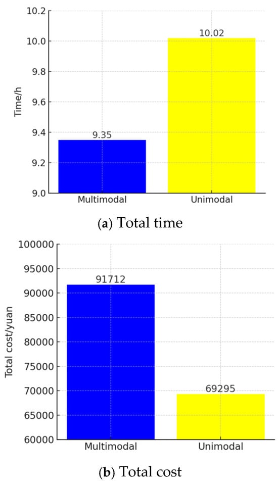 When the cargo volume is 20 tons, taking time sensitivity and cost sensitivity as examples, the optimal transportation route for emergency supplies is 1 → 2 → 8 → 14 → 16. In this case, rail transportation is used from starting point 1 to node 2, helicopter transportation is used from node 2 to node 8, road transportation is employed from node 8 to node 14, and helicopter transportation is used again from node 14 to the destination node 16. When the decision-making department’s tolerance for time and cost risks for emergency supplies is moderate, the total time for the multimodal transportation scheme is 9.35 h, and the total cost is 91,712 RMB. In contrast, if the entire journey is conducted via unimodal road transportation, the total time is 10.02 h, and the total cost is 69,295 RMB. The comparison between the two transportation methods is shown in Figure 10.