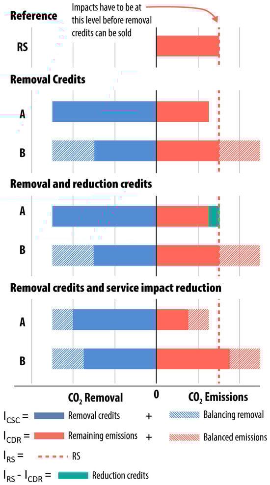 In Figure 2, we present an example of how two CDRs (A and B) capturing and storing the same amount of carbon, but with different emissions (ICDRA < IRS < ICDRB), could allocate their emissions following MB principles depending on their ability to sell credits and to be compensated for selling a service with reduced climate impact. The “Removal Credits” panel represents the situation where a CDR can sell removal credits as well as an additional service. In this situation, CDR A would allocate all its CSC to removal credits and the remaining emissions would be associated with the additional service, which still has a lower GWP than the RS. In this same situation, CDR B, which has higher emissions, must first balance its emissions with some of its removal to reach the level of the RS before the remaining CSC can be sold as removal credits.