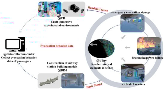 This study developed a simulation experimental platform for evaluating emergency evacuation signage systems in rail transit, as depicted in Figure 1. The platform is composed of four integral components: BIM, Unity, virtual reality, and a data collection center. Their respective functions are outlined below: