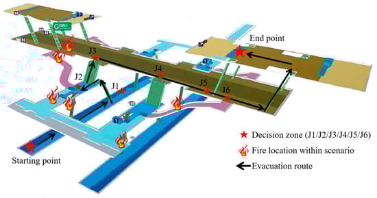 The experiment selected three routes (route 1, route 2, and route 3) within the Hujialou subway station model in Beijing, and all eight experimental scenarios were conducted in route 1. Route 1 starts from the platform of Line 10 and ends at the concourse of Line 6. The route is long and complex, with a total of 6 decision points, as shown in Figure 2.
